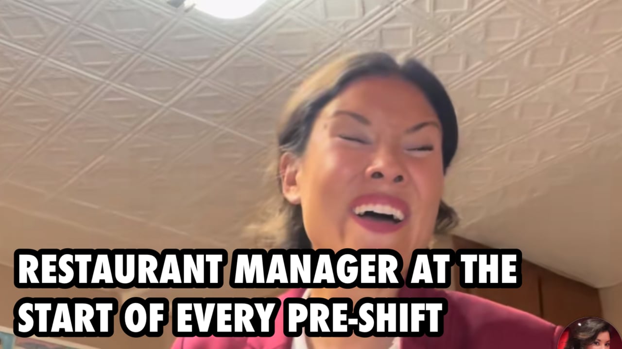 RESTAURANT MANAGER CONTINUES TO INTERROGATE SERVER DURING PRE-SHIFT WHILE HE'S TRYING TO EAT